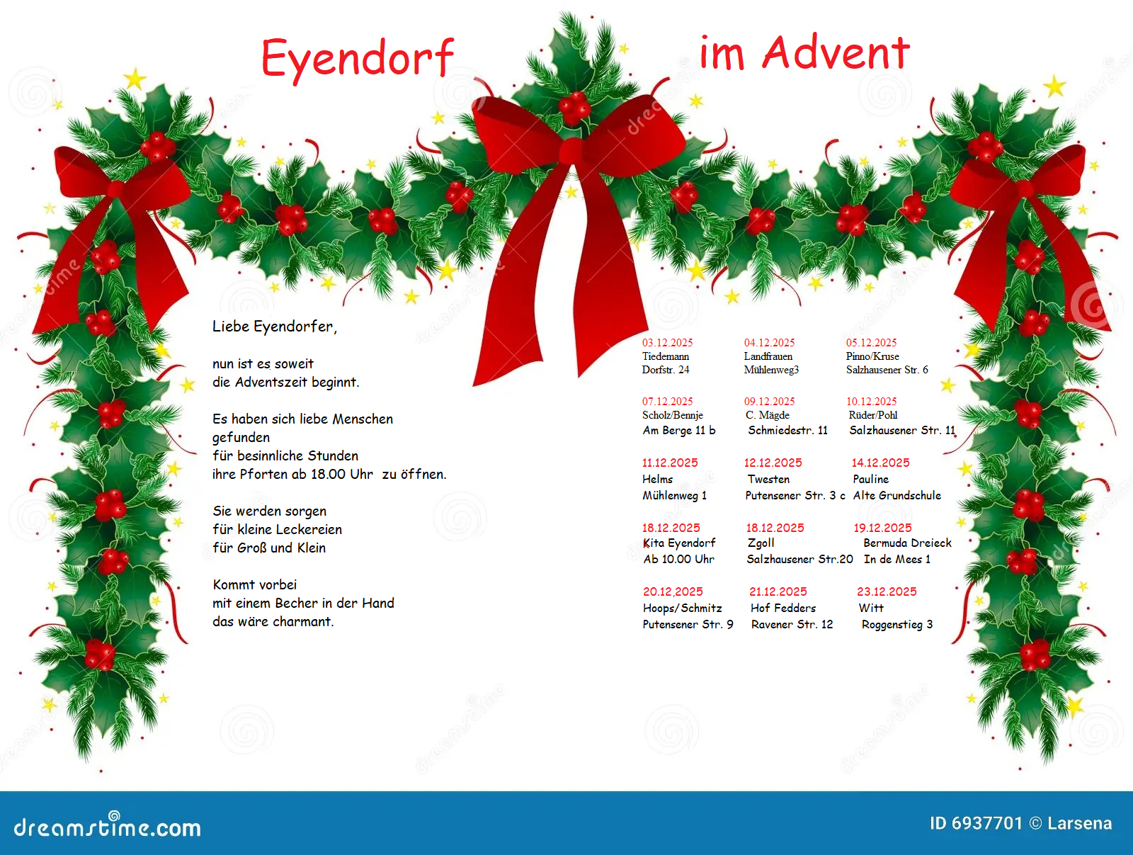 Dieses Jahr haben sich einige Eyendorfer zusammengefunden und richten an den einzelnen Adventstagen jeweils ein besinnliches Event aus.